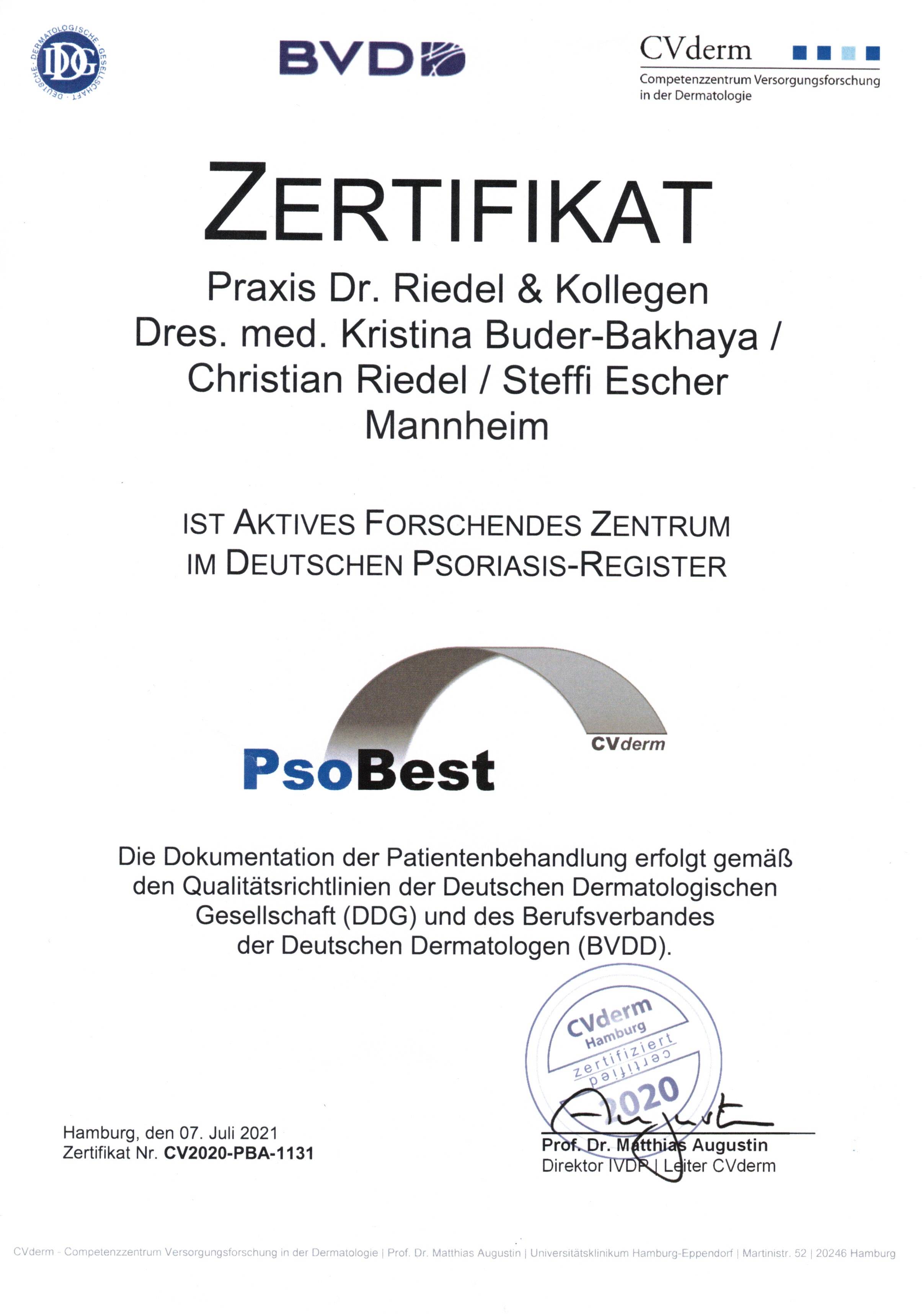 Wir freuen uns über das Pso Best Zertifikat. Damit wurde unsere Praxis als Aktives Forschendes Zentrum im Deutschen Psoriasis Register ausgezeichnet.