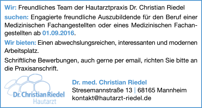 Unsere Praxis sucht eine neue oder einen neuen Auszubildende(n) für den Beruf des "Medizinischen Fachangestellten" ab September 2016.